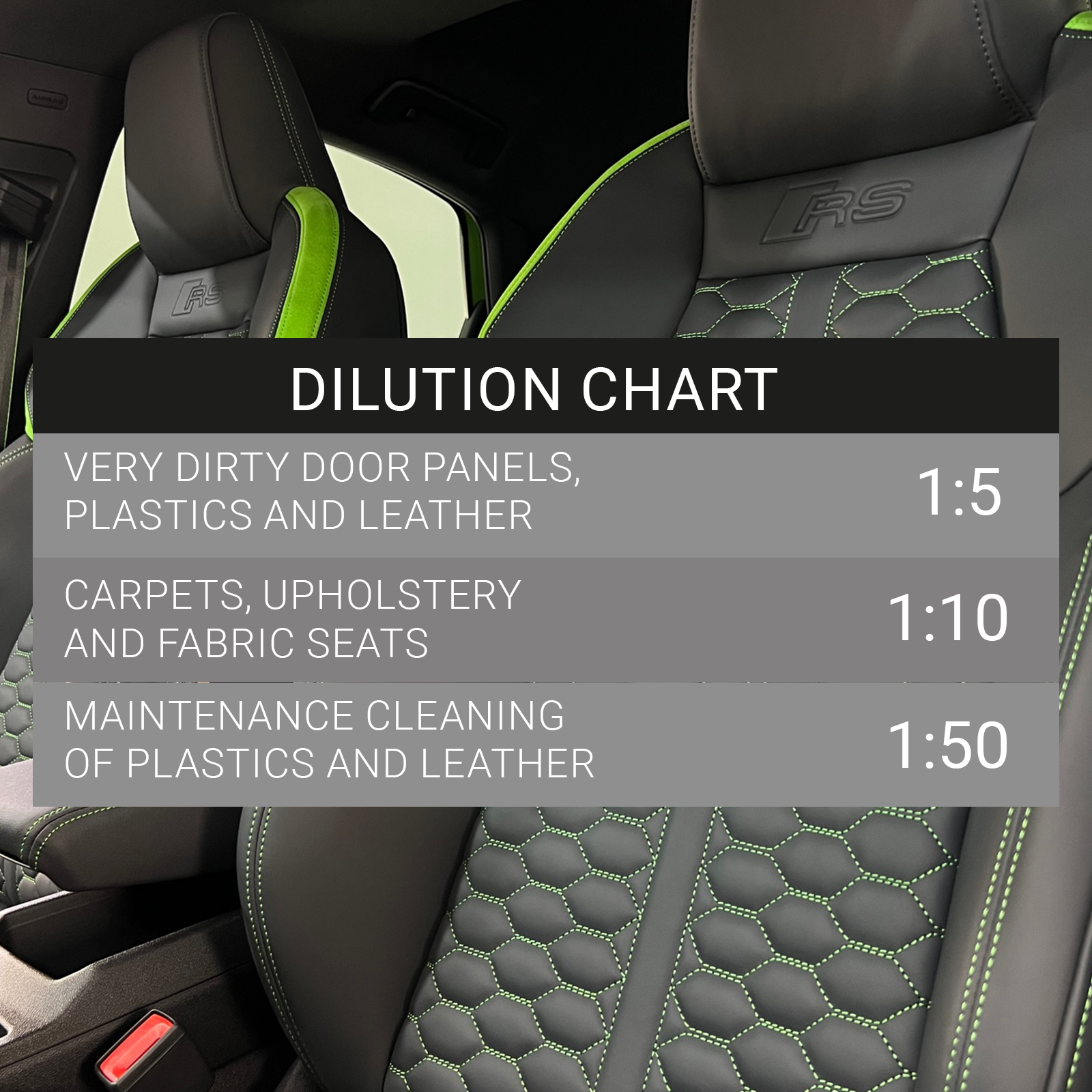 - Cleaning the sides of doors, plastics and very dirty leather – 1:5.