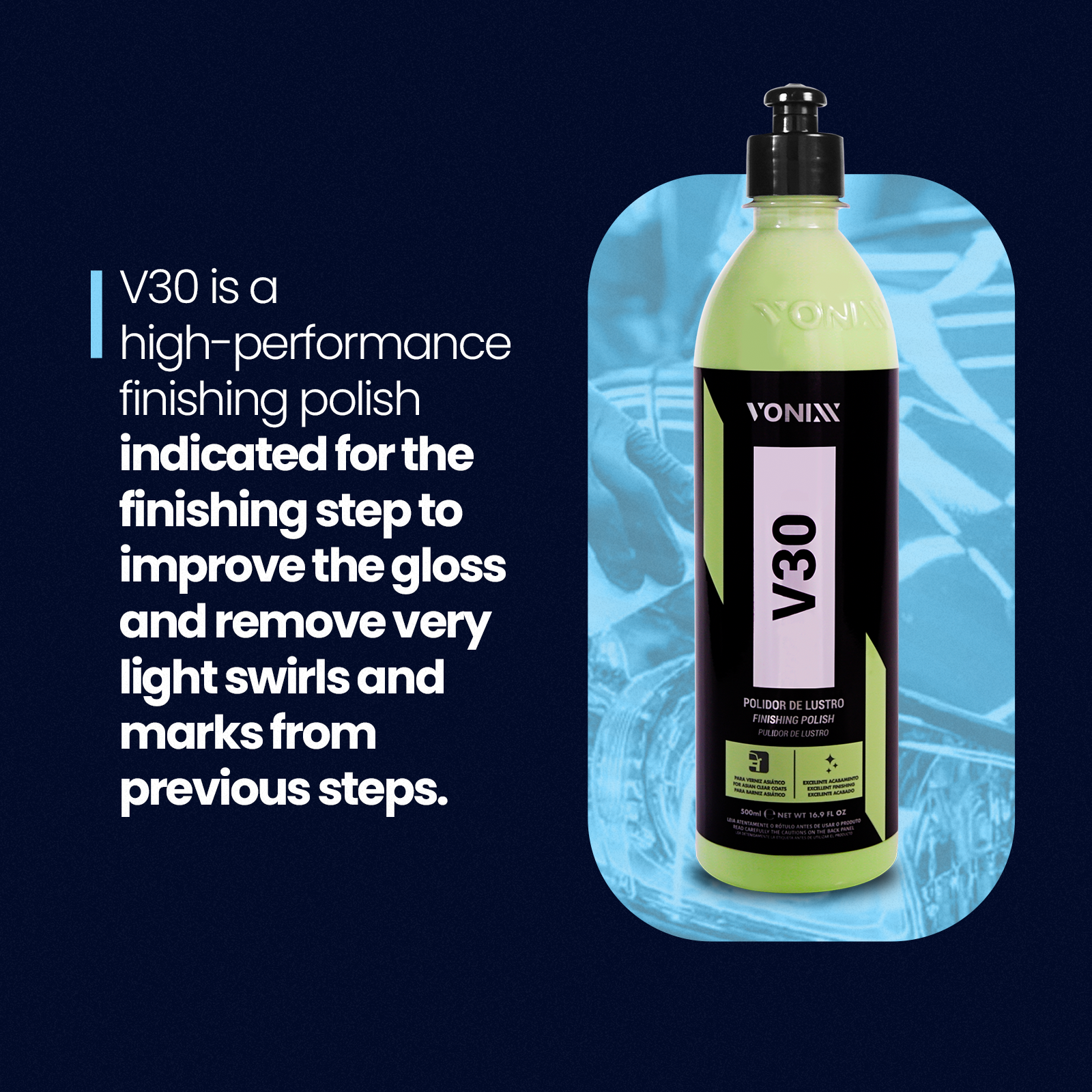 Polisher V30 is a polishing compound from the Asian line, designed especially for soft varnish paintings. Its use is recommended for removing holograms and surface marks during the polishing stage, providing an intense and deep shine.