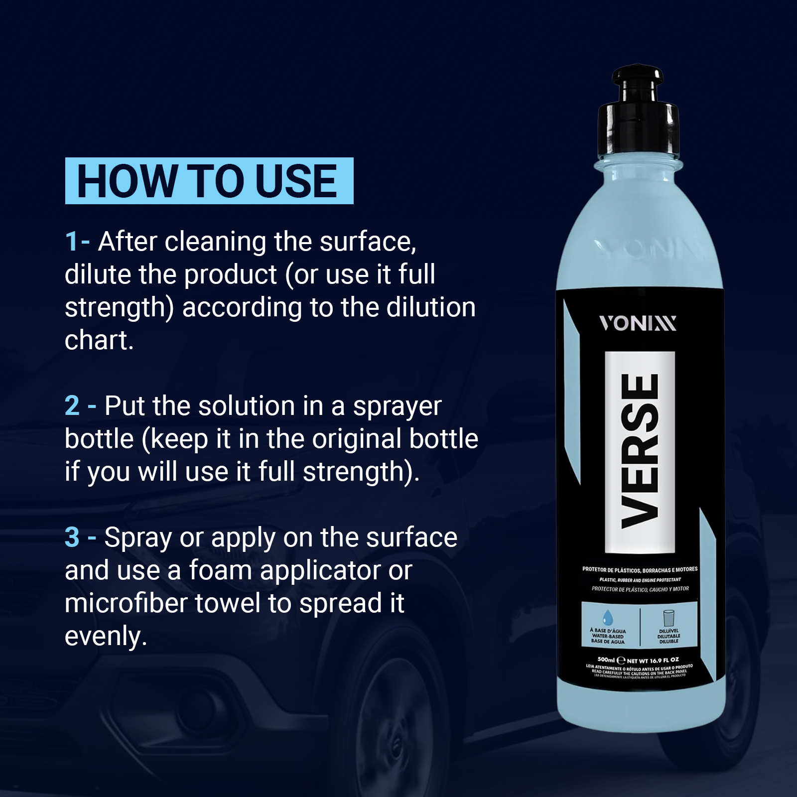 - Versatile Surface Protection: Vonixx Verse can be used on plastic parts, rubbers, engine bay, wheel wells and chassis compartments. Engineered to safeguard your car.