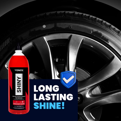 - 01un Vonixx - Shiny Tire Dressing 16.9fl oz (500ml): Is a product developed exclusively for use on tires that renews, protects and gives intense, long-lasting shine to tires. The product does not come off when in contact with water, and can last up to 60 days, yields 15 to 20 applications on small cars and maintains the tire's wet shine appearance.